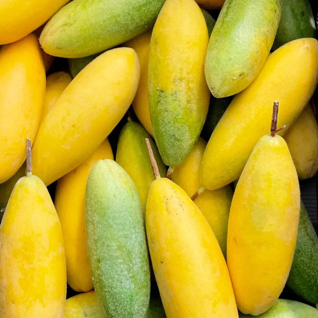 Banana passion fruit, also known as curuba or taxo, is a tropical fruit known for its bright yellow-orange flesh and subtly tangy, aromatic flavor.